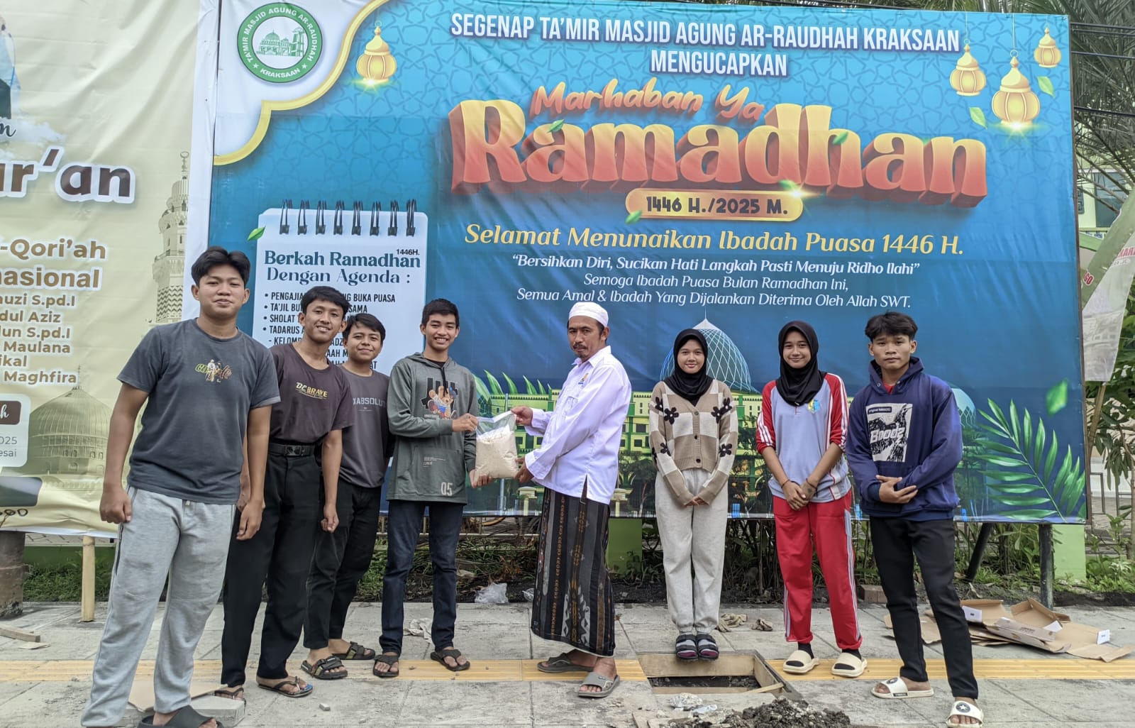 Penyerahan zakat fitrah berlangsung di Masjid Agung Ar-Raudlah Kraksaan, yang beralamat di Jalan Rengganis Nomor 1 Kraksaan. OSIS SMKN 1 Kraksaan secara langsung menyerahkan zakat fitrah kepada pihak UPZ yang bertugas. Acara ini berlangsung dengan penuh kekhidmatan, dihadiri oleh sejumlah perwakilan sekolah serta pengurus takmir masjid. Kehadiran para siswa dalam kegiatan ini menunjukkan dukungan penuh terhadap program sosial yang telah menjadi bagian dari budaya sekolah.