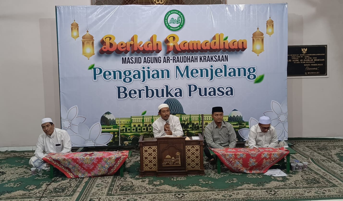 Dalam rangka mengisi bulan suci Ramadhan 1446 H dengan kegiatan keagamaan, Masjid Agung Ar-Raudlah yang berlokasi di Jalan Rengganis Nomor 1, Kelurahan Patokan, Kecamatan Kraksaan, Kabupaten Probolinggo, menggelar pengajian menjelang berbuka puasa pada hari kedua Ramadhan, Ahad (2/3/2025). Kegiatan ini dihadiri oleh ratusan jamaah yang datang untuk mendapatkan ilmu dan keberkahan Ramadhan.